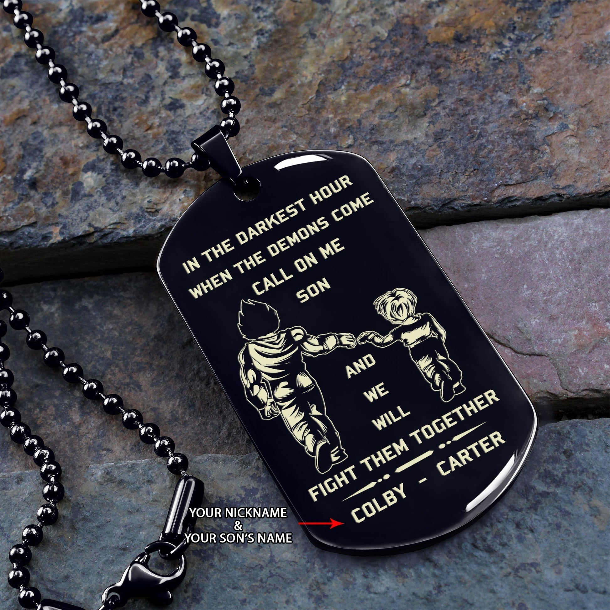 Customizable engraved dog tag gift from dad to son, In the darkest hour, When the demons come call on me son and we will fight them together