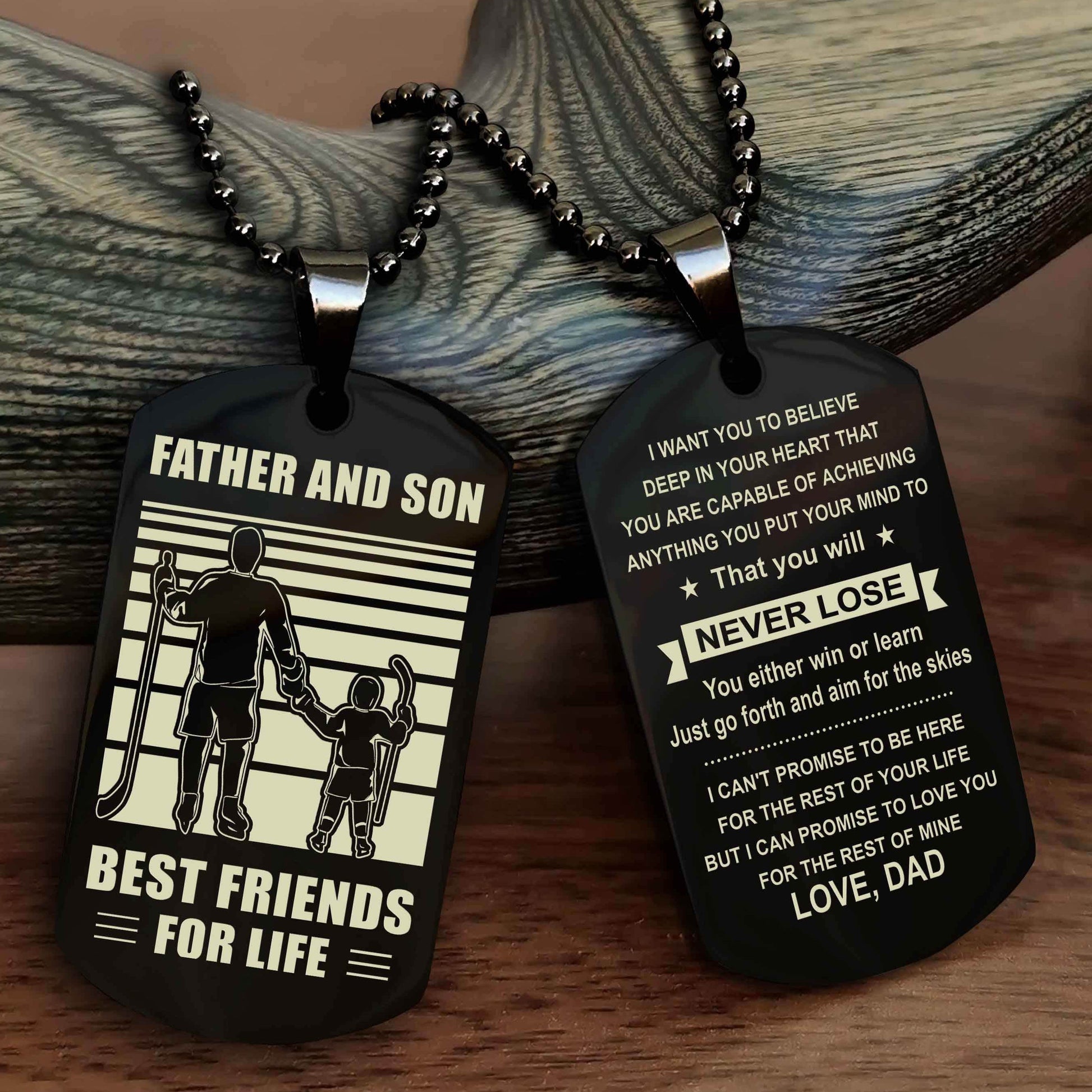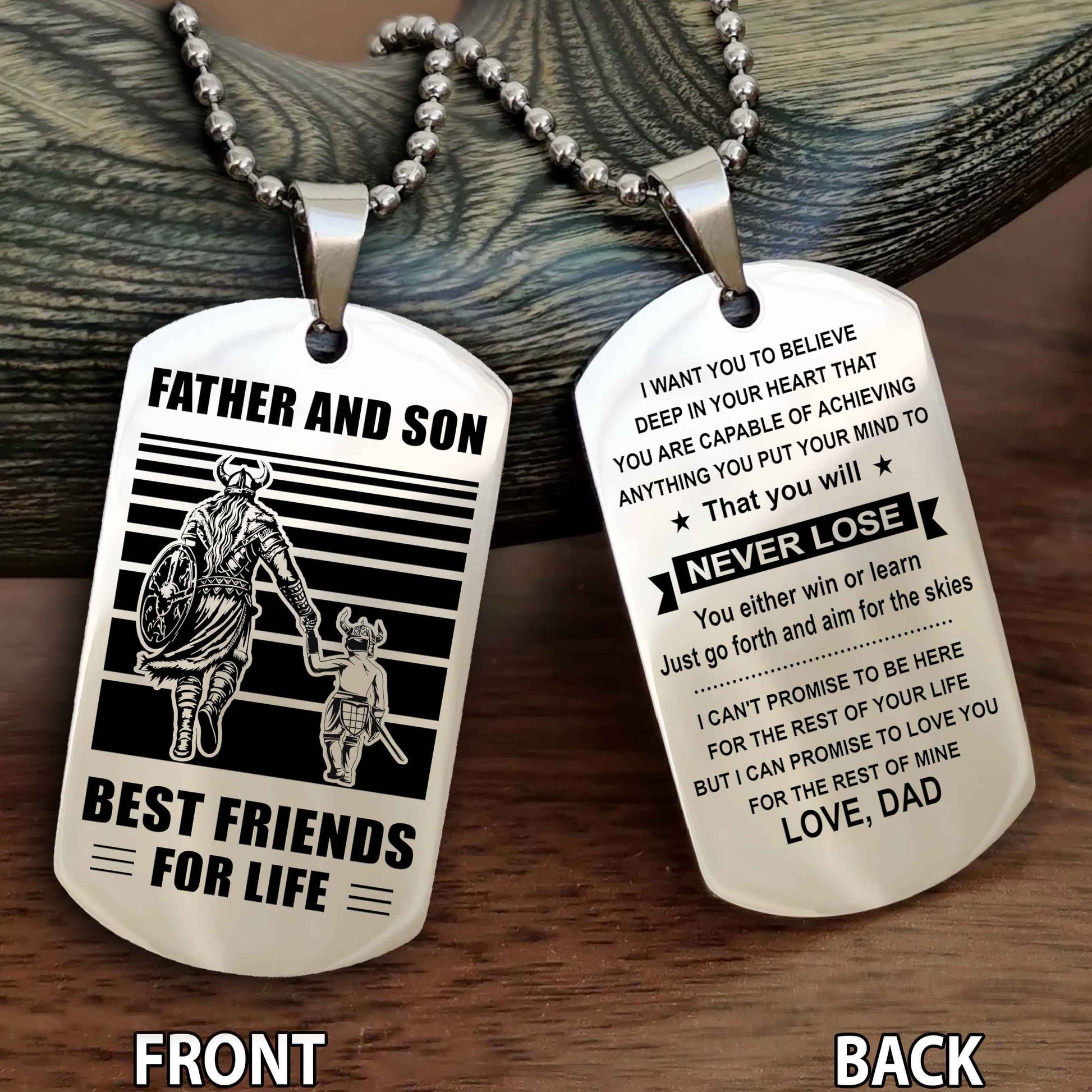 The dog tag contains a meaningful message that a father wants to share with his son. It is a perfect gift for birthdays, anniversaries, or any special occasion.
