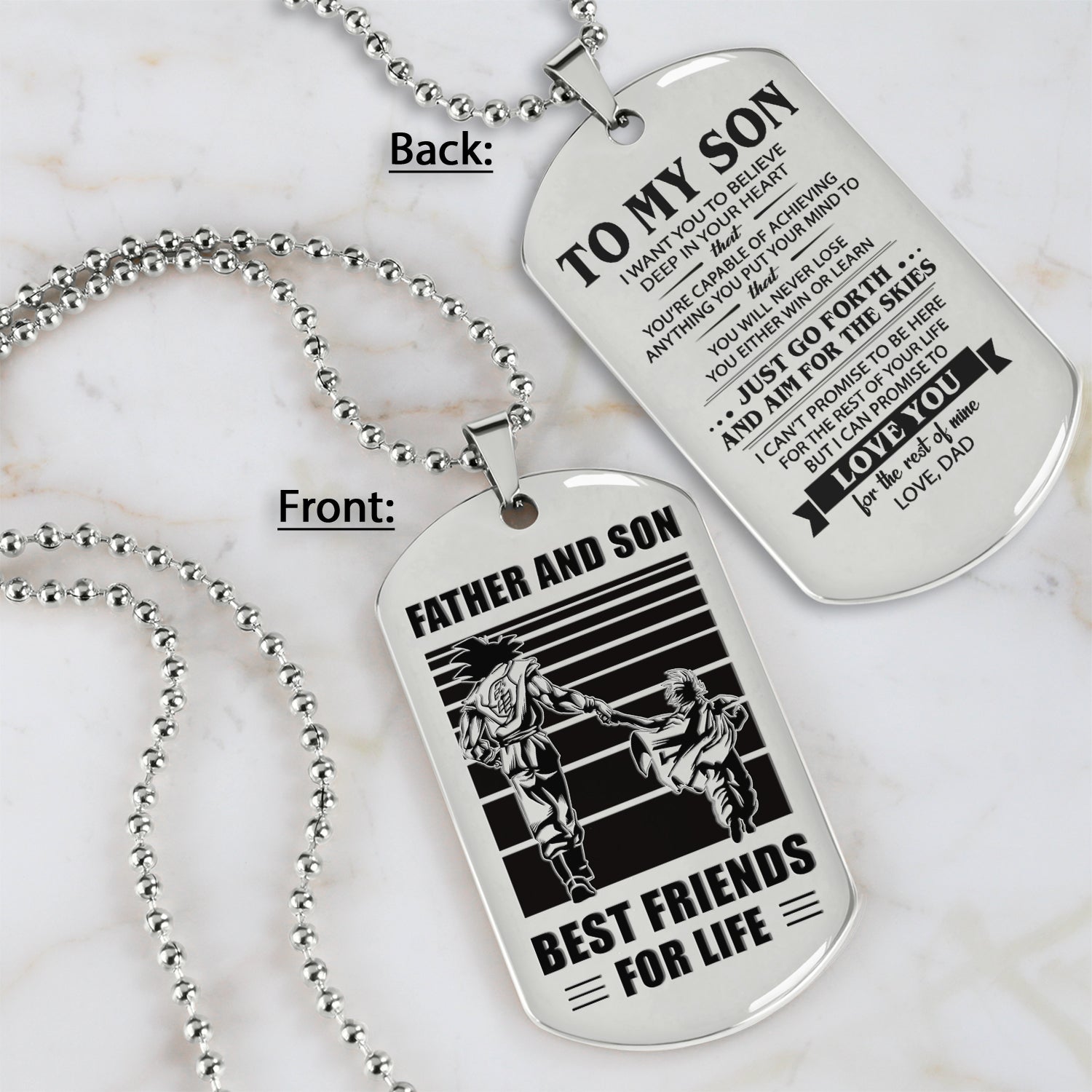 The dog tag contains a meaningful message that a father wants to share with his son. It is a perfect gift for birthdays, anniversaries, or any special occasion.