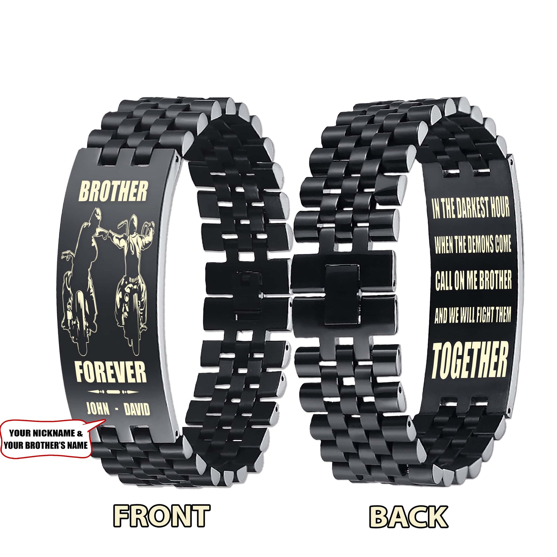 Sport bike customizable engraved brother bracelet double sided gift from brother, brother forever, in the darkest hour, When the demons come call on me brother and we will fight them together