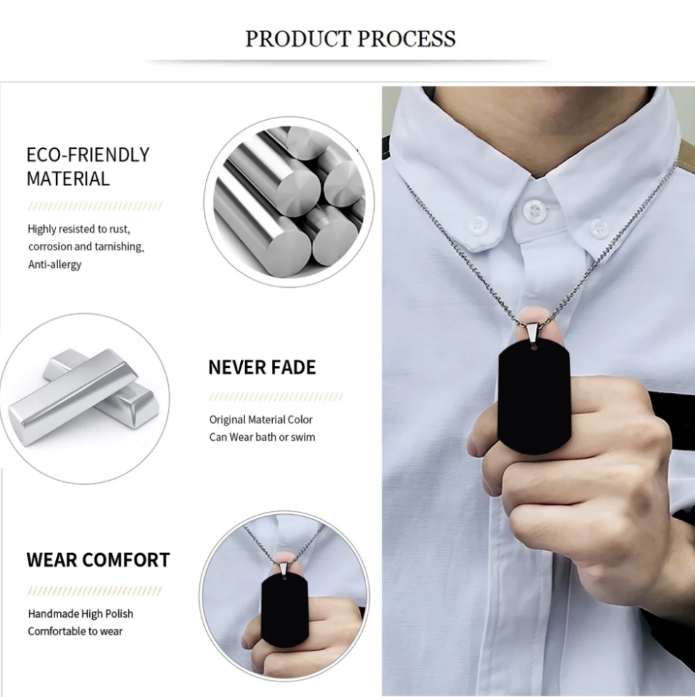 - Weight = 16.4g; Dog tag 48mm x 28mm; Luxury Military Necklace: 24″ (61cm) with upgraded clasp